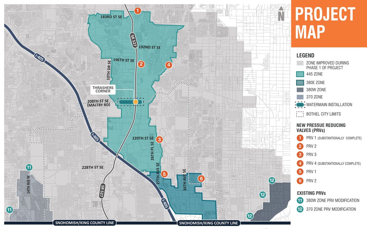 The Alderwood Water & Wastewater District (AWWD) is progressing with the second phase of our Water Pressure Reduction Project in the Canyon Park/Bothell East area, which includes part of unincorporated Snohomish County and City of Bothell. The project aims to improve the reliability, efficiency, and resilience of the water distribution system, while reducing high-water pressure in areas that exceed AWWD and Washington Department of Health guidelines.